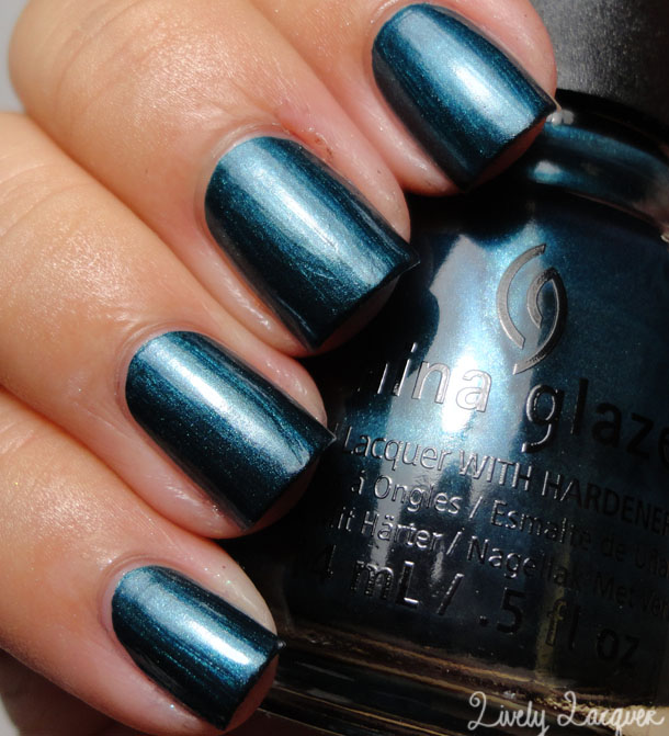 Tongue & Chic: Teal-blue (or turquoise?) shimmer (I'd say it's borderline frost). My photos make this polish look very frosty, but I don't find it as noticeable when the polish is 100% dry. It's a very pretty jewel toned shade. Formula is very nice too (if you ignore the slight frost) - I did two coats out of habit but one could have done the trick also. I like.